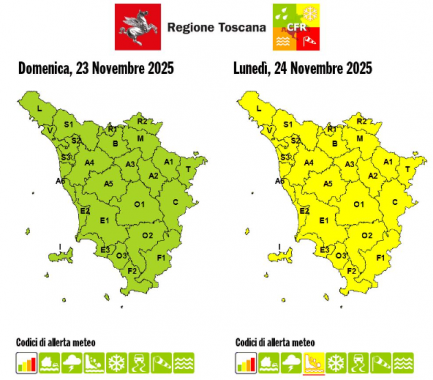 TOSCANA — Piogge e temporali in arrivo sulla Toscana che, già da questa sera, sarà interessata da una nuova perturbazione. La sala operativa della protezione civile ha emesso un codice giallo per rischio idrogeologico e idraulico del reticolo minore su tutta la regione nella giornata di domani, lunedì 24 Novembre.