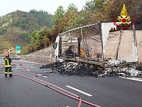 MASSAROSA — Dopo l'incendio divampato ieri pomeriggio sulla bretella Lucca-Viareggio dell'autostrada A11, partite da un camion e propagatesi al bosco, i vigili del fuoco hanno lavorato tutta la notte per tenere sotto controllo il serbatoio del mezzo, che ha continuato a bruciare in maniera controllata fino all'esaurimento del carburante. Un'operazione andata avanti molte ore e che ha visto sul posto 12 vigili del fuoco, impegnati a raffreddare e tenere monitorato il serbatoio.