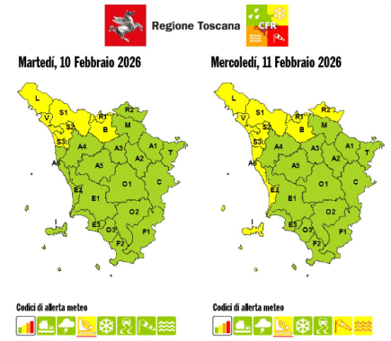 Sempre la sala operativa ha emesso un'allerta gialla per vento forte dalle 8 alla mezzanotte di domani, mercoledì 11 Febbraio, su costa centrale, Arcipelago e Alto Mugello e una per mareggiate dalle 12 alla mezzanotte di domani su costa centrale e Arcipelago.