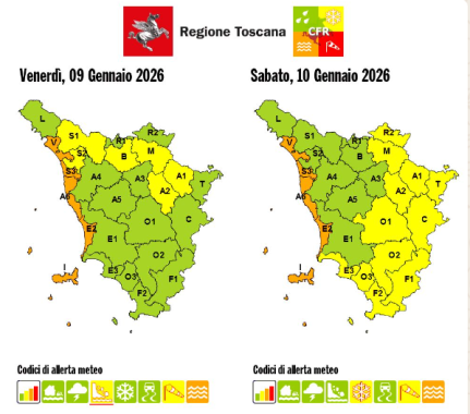 Nella giornata di oggi in corso anche un'allerta gialla per rischio idrogeologico sulla Toscana centro-settentrionale e per rischio vento sulla costa centro-settentrionale e sull'arcipelago, con raffiche fino a 80-100 km/h sulla costa centro-settentrionale e sull'Elba.