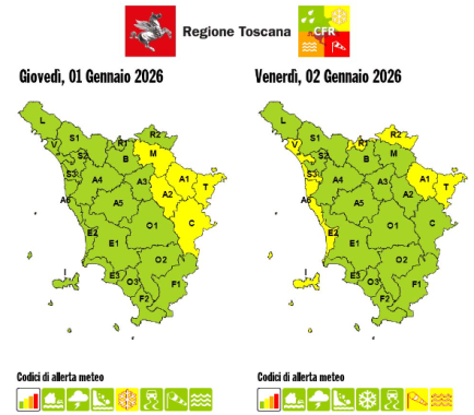 Le previsioni meteo per la giornata di venerdì 2 Gennaio indicano raffiche di libeccio fino a 80-100 km/h sull'Arcipelago a nord di Capraia, sui crinali e sui versanti emiliano-romagnoli dell'Appennino, fino a 60-80 km/h sulla costa centro-settentrionale e fino 40-60 km/h sul resto delle zone centro-settentrionali della regione.