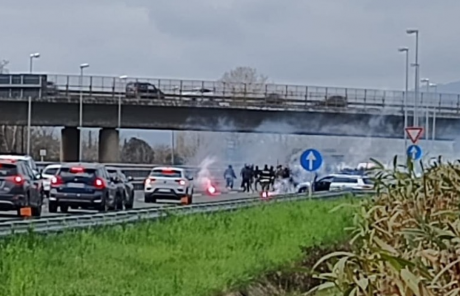 Durante il parapiglia, alcuni fumogeni sono stati lanciati sulla carreggiata dell'autostrada, costringendo le auto nel traffico a fermarsi.